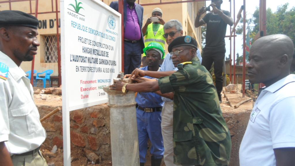 Uvira, le 26 janvier 2017 – La cérémonie de pose de la première pierre de cet ouvrage a eu lieu ce jeudi matin, en présence du Chef du Sous-bureau de la Monusco-Uvira (Ould Mohamed El Hacen) et de l’Administrateur du Territoire Assistant (Sephanie Milenge Matundanya). D’un coût global de 15371 dollars américains entièrement financés par la Monusco, le futur hangar va nettement améliorer les conditions de travail à l’Auditorat Militaire de Garnison d’Uvira. Concrètement, l’ouvrage de 19 mètres sur 5,5 portera sur la fixation de poteaux métalliques, le placement de grillages tout autour du hall, la construction d’un mur de sécurité à l’endroit même où sera placée la barre et bien entendue celle de la toiture. Cet appui de la Monusco rentre dans le cadre de la restauration de l’autorité de l’Etat. A travers cet appui, la Monusco espère ainsi améliorer les conditions de travail des magistrats militaires d’Uvira. Elle entend aussi faciliter au public l’accès aux audiences, comme le recommande la Constitution congolaise.