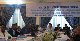 Dans son intervention, le Chef de la division des Affaires Politiques de MONUSCO-Bukavu a rappelé les engagements nationaux de la RDC : la réforme du secteur de la sécurité (RSS), la consolidation de l’autorité de l’Etat, en particulier dans l’Est de la RDC, la décentralisation, la promotion du développement économique, la réforme structurelle des institutions de l’Etat et la promotion des objectifs de réconciliation nationale, de tolérance, et de démocratisation. Le Ministre provincial du plan a fait remarqué que des progrès ont été faits dans la région dans le domaine de la restauration de l’autorité de l’Etat, notamment la fin de la rébellion du « mouvement du 23 mars » au Nord Kivu.