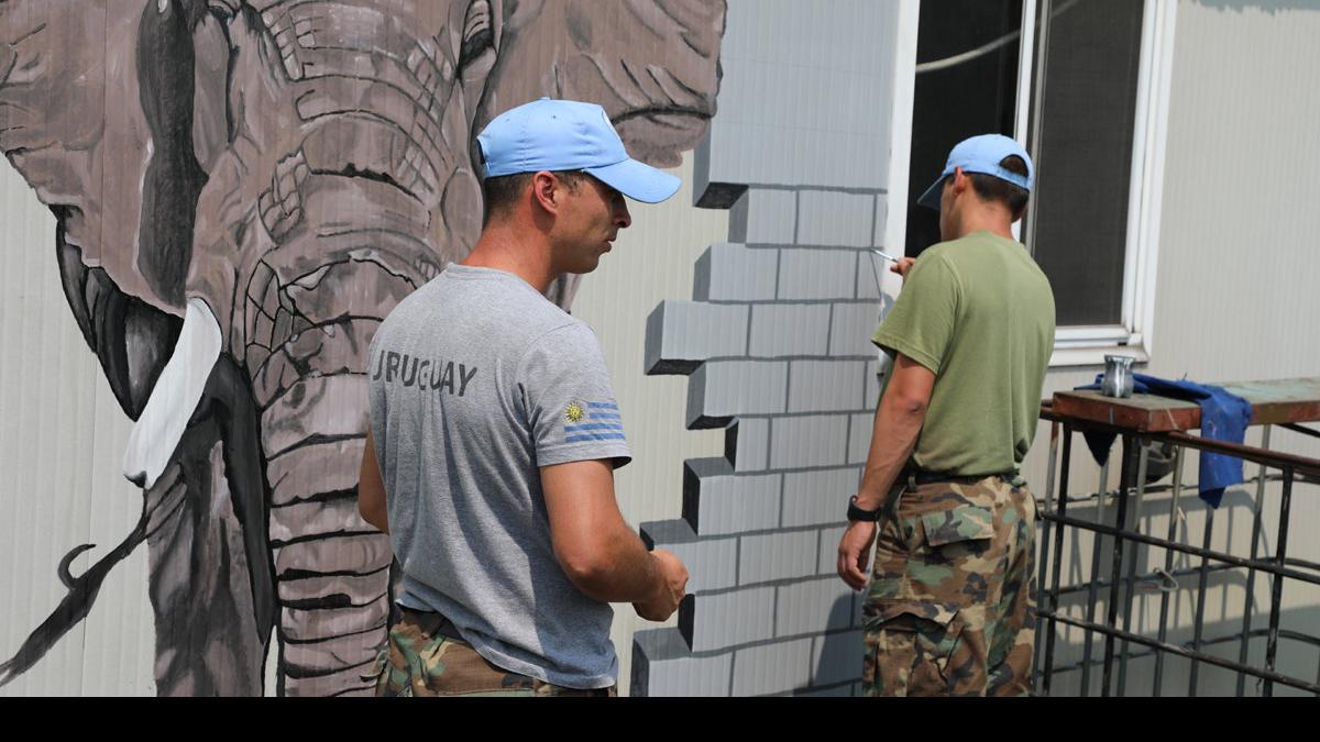Goma, le 26 février 2018 – A peine le pied posé dans l’enceinte du bataillon uruguayen de la MONUSCO à Goma, le visiteur remarque d’emblée ce premier mur orné d’un style particulier pour la capitale du Nord-Kivu. Plus on avance dans le camp, et plus des tableaux de mille couleurs ornant les parois des containers se révèlent à nos yeux ébahis. Sommes-nous dans un camp militaire ou dans un centre d’expression créative ?