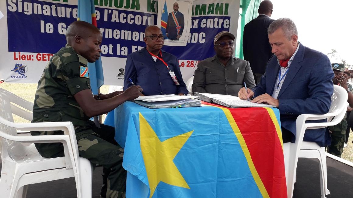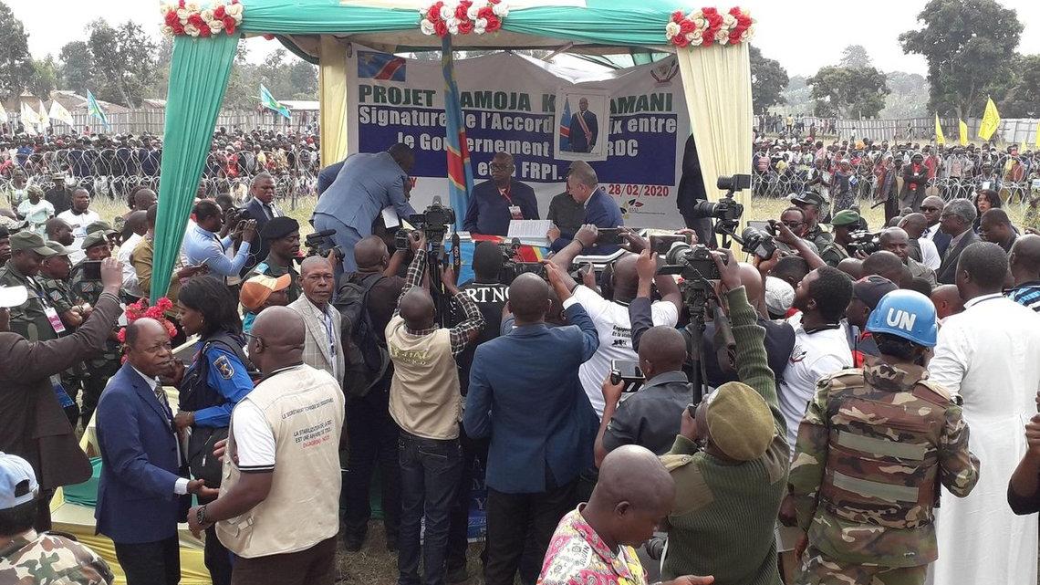 Le Gouvernement congolais a signé ce vendredi 28 février à Gety, à environ 60 kms de Bunia, capitale provinciale de l’Ituri, un accord de paix avec la Force de Résistance Patriotique de l'Ituri (FRPI), dernier grand groupe armé opérant dans cette province de l’est de la République Démocratique du Congo (RDC). Cet accord tant attendu par les populations locales est destiné à restaurer la paix, la sécurité et la stabilisation dans ce territoire situé à l'est du pays.