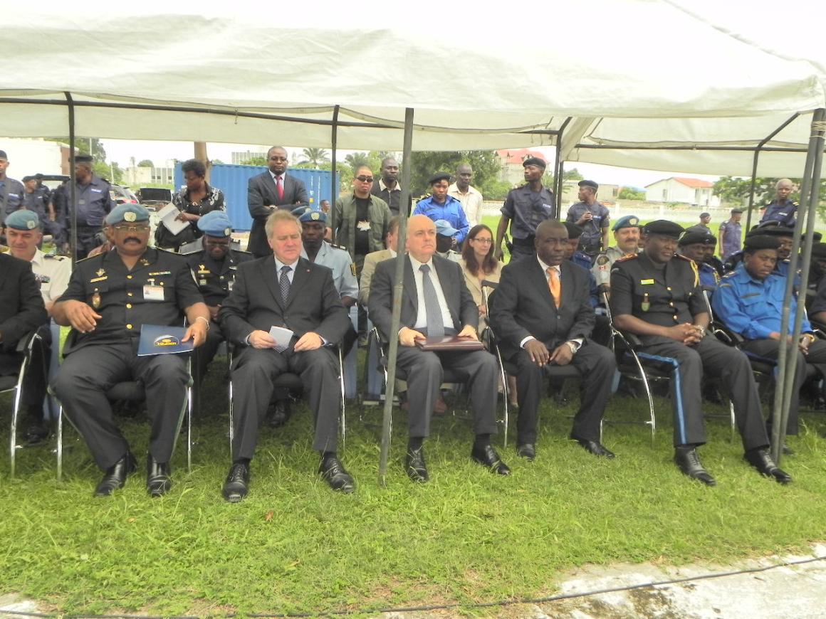 Vue des officiels lors de la cérémonie | Echantillons des équipements (Don de la Monusco) |