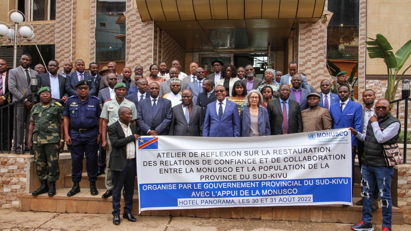Organisé du 30 au 31 août 2022 à Bukavu, cet atelier visait à servir de cadre de réflexion pour une analyse conjointe de la situation qui a conduit à une rupture de confiance entre la MONUSCO et les populations du Sud-Kivu, à la suite des récentes manifestations violentes dans certaines villes de l’est du pays pour demander le départ de la MONUSCO du territoire national. Les manifestants dénonçaient la persistance de l'activisme des groupes armés et des tueries enregistrées dans le pays depuis plus de deux décennies déjà.