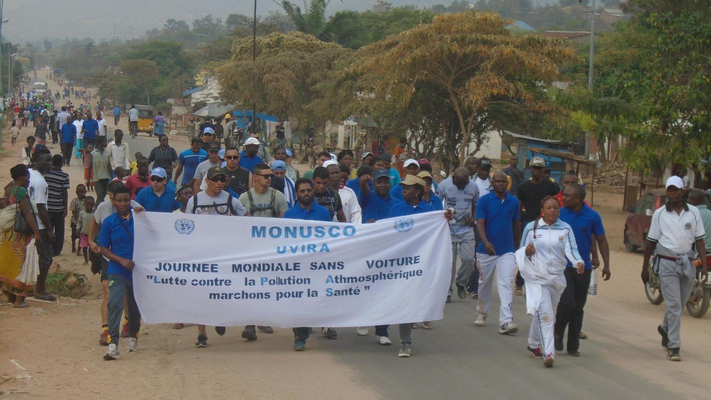 Uvira, le 1er octobre 2016 - La Monusco a célébré ce samedi 1er octobre 2016, à sa manière, la Journée Mondiale sans Voiture. Observée le 22 septembre de chaque année, cette Journée n’a pu avoir lieu la semaine dernière, en raison de certaines contingences opérationnelles. Ce samedi 1er octobre donc, dès 6 heures locales, les agents de la Mission des Nations Unies en RDC, bureau d’Uvira, ont organisé une marche dite pour la santé.