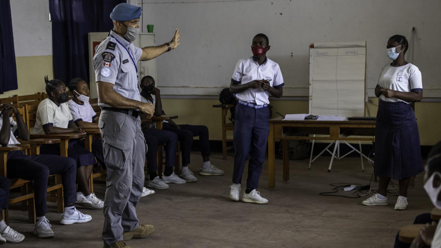 Jean-Guy Isaya, chef d’équipe des policiers spécialisés en violences sexuelles basées sur le genre au sein de UNPOL, interagit ici avec quelques élèves de l'Institut Don Bosco Ngangi à Goma. / Photo : Kevin Jordan