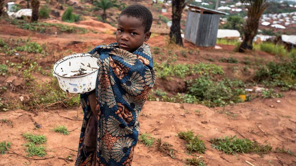 Un enfant tient une casserole de criquets dans un camp pour personnes déplacées en République démocratique du Congo.