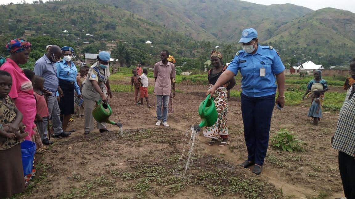 Les policières de la MONUSCO offrent des intrants agricoles aux femmes maraîchères d’Uvira