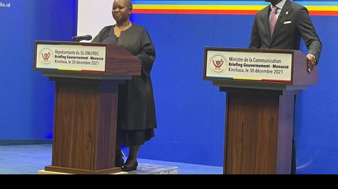 Mme Bintou Keita et M. Patrick Muyaya lors de la conférence de presse conjointe , le 30 décembre à Kinshasa. Photo MONUSCO