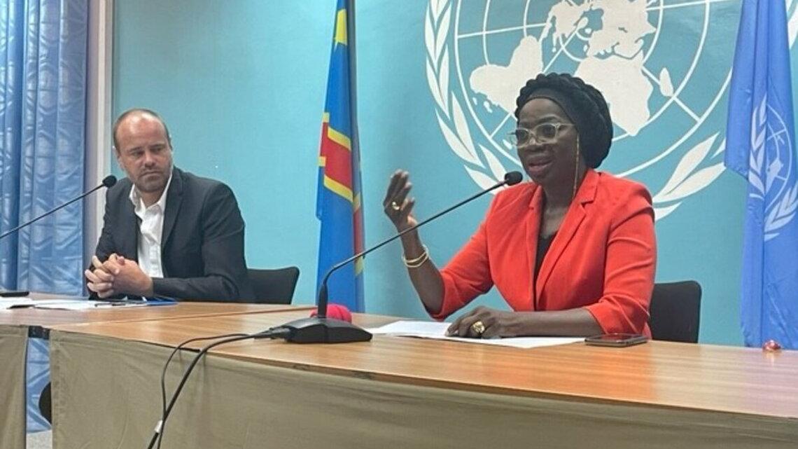 Le porte-parole de la MONUSCO, Mathias Gillmann et la Représentante d'ONU Femmes, Mme Awa Ndiaye Seck, lors de la conférence de presse