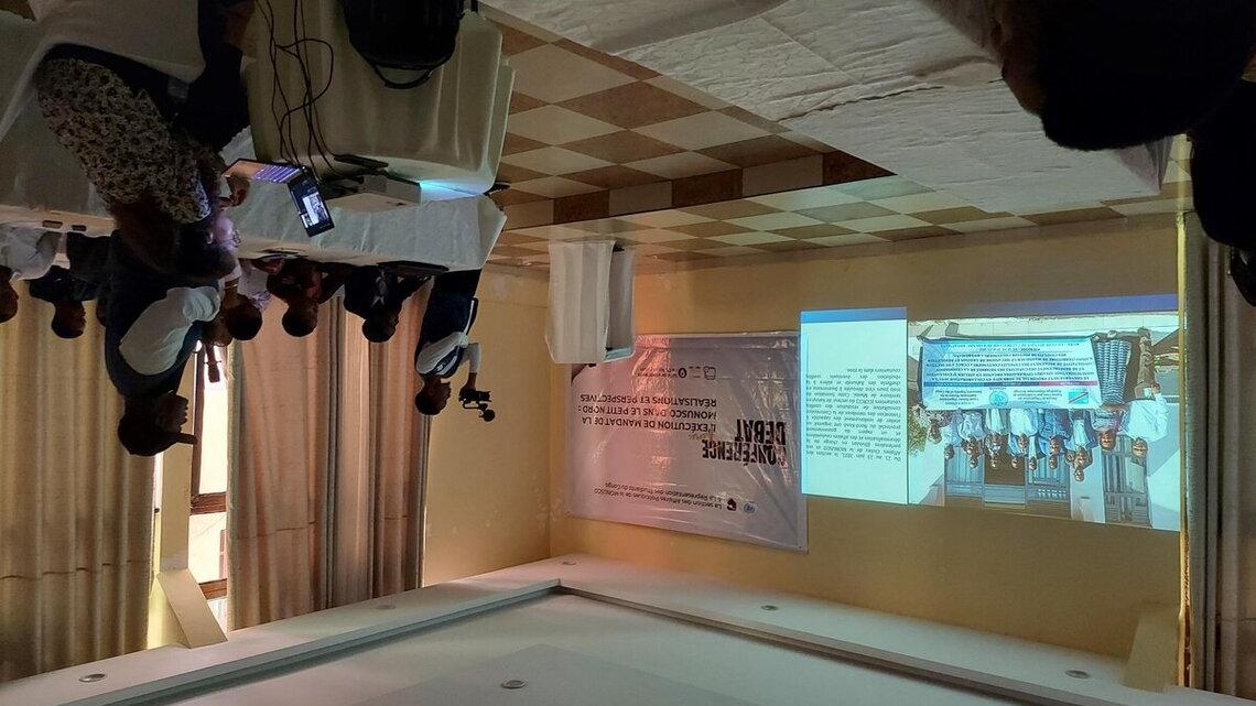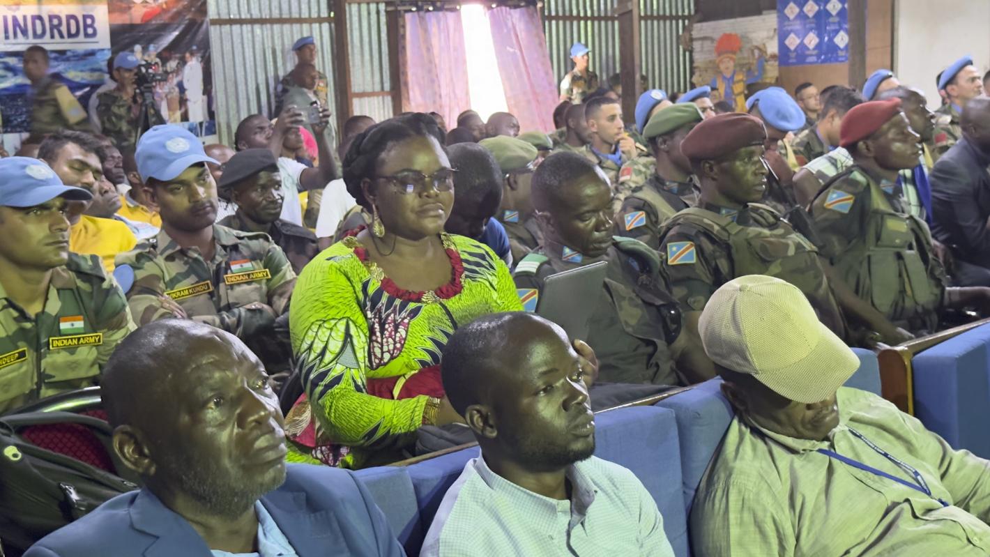 Les militaires de la Force onusienne ont projeté des vidéos expliquant les activités entreprises sur le terrain pour la mise en œuvre du pilier protection des civils, des programmes communautaires et de leurs divers partenariats avec les FARDC. / Photos Kevin Kordan