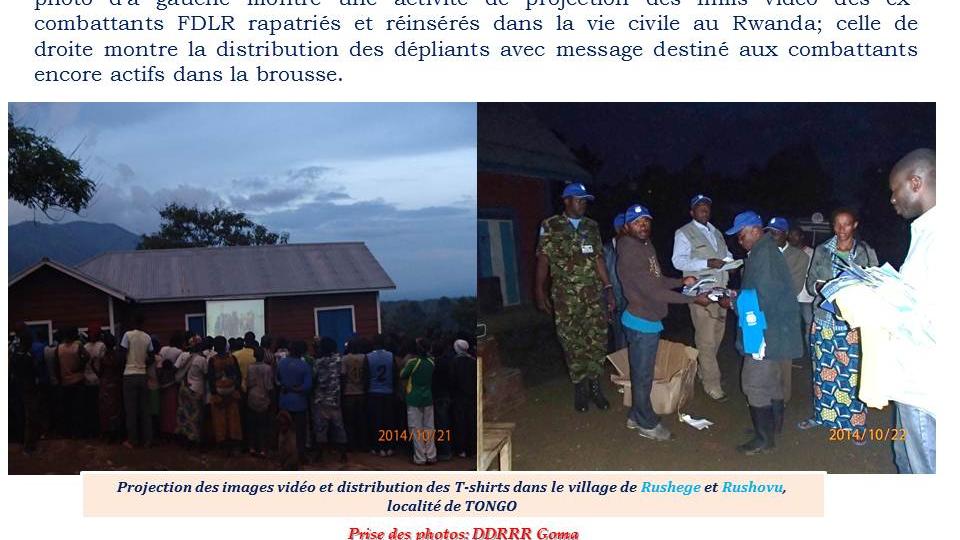 Les activités de sensibilisation à travers la projection de vidéo et la distribution des dépliants et T-shirt s’accentuent par le DDR/RR, sous le lead de son unité PIO. La photo d’à gauche montre une activité de projection…