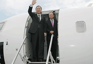 Kinshasa, 23 mai 2013 – Le Secrétaire général des Nations Unies, Ban Ki-moon, est arrivé ce jeudi matin à Goma, province du Nord Kivu, en provenance de Kinshasa, dans le cadre d'une mission conjointe dans la sous-région avec le Président du Groupe de la Banque Mondiale, Jim Yong Kim. L'objectif de cette visite est de soutenir la mise en œuvre de l'Accord-cadre signé le 24 février dernier à Addis-Abeba par la République démocratique du Congo, le Rwanda, l'Ouganda, ainsi que huit autres pays de la sous-région.