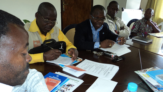 Photo MONUSCO Piergiorgio Paglialonga. Les membres de la délégation reçus à la MONUSCO. Au fond à droite, le Chef de bureau M. Cheikh Bangoura; à sa gauche, le Commissaire de la PNC M. Bisengimana. . Mbuji Mayi, 14 novembre…